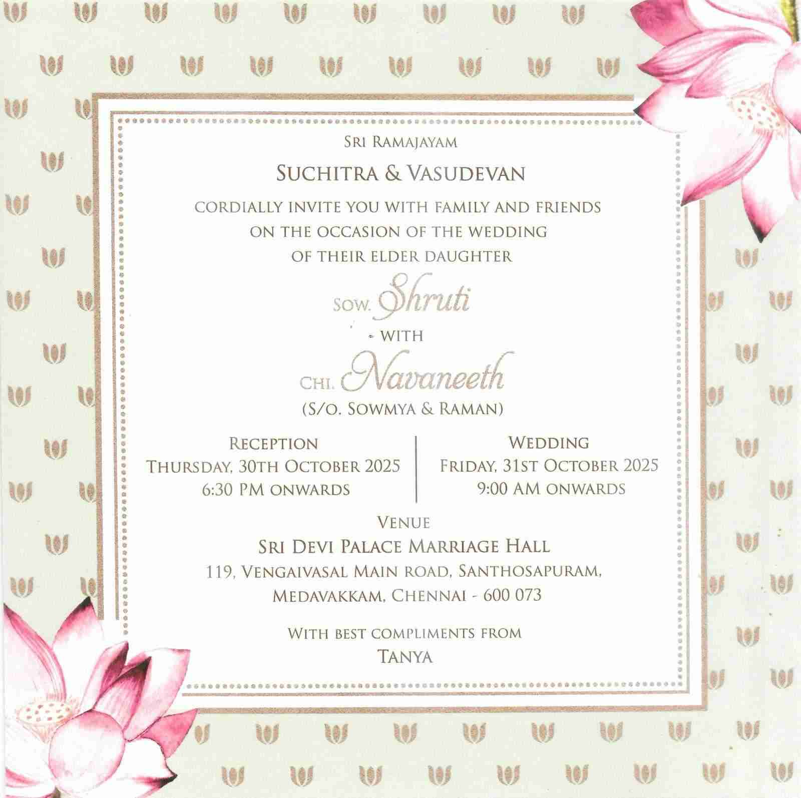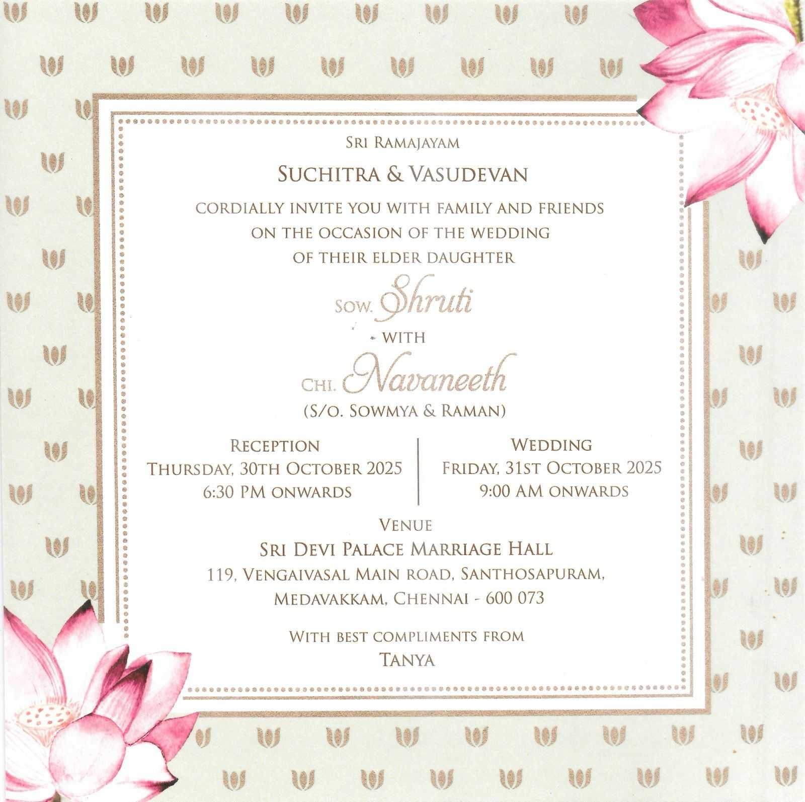 Muhurtham - 9 AM IST Onwards, Sri Devi Palace Marriage Hall, Medavakkam.